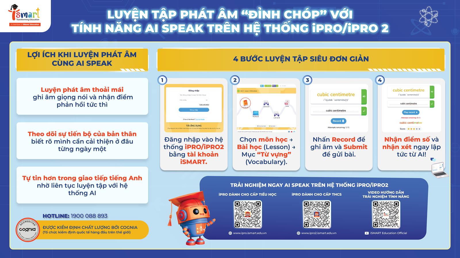 Với vị thế là đơn vị tiên phong trong lĩnh vực EdTech (Công nghệ giáo dục) tại Việt Nam, iSMART không ngừng nâng cấp hệ thống bài giảng số và nền tảng học tập trực tuyến iPRO (Cấp tiểu học)/iPRO2 (Cấp Trung học cơ sở). Tính năng AI Speak - Trợ lý phát âm AI được tích hợp trên nền tảng LMS là một bước tiến quan trọng, đóng vai trò như một "trợ lý cá nhân” giúp học sinh chấm chữa phát âm ngay tại nhà. Công nghệ này có khả năng phân tích, chấm điểm và phản hồi tức thì độ chính xác trong phát âm của học sinh khi học tiếng Anh qua môn Toán và Khoa học iSMART.