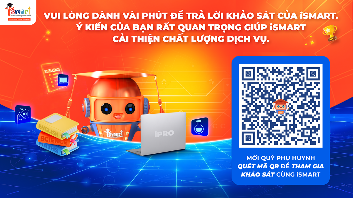 Khép lại Học kỳ I 2025-2026, iSMART Hồ Chí Minh trân trọng mời Quý Phụ huynh và Nhà trường tham gia khảo sát chất lượng chương trình. Mọi ý kiến đóng góp là nền tảng cốt lõi để chúng tôi tối ưu hóa công nghệ và phương pháp giảng dạy. iSMART xin chân thành cảm ơn sự đồng hành và những phản hồi quý báu của Quý Phụ huynh và Nhà trường trong hành trình nâng cao chất lượng giáo dục cho học sinh.